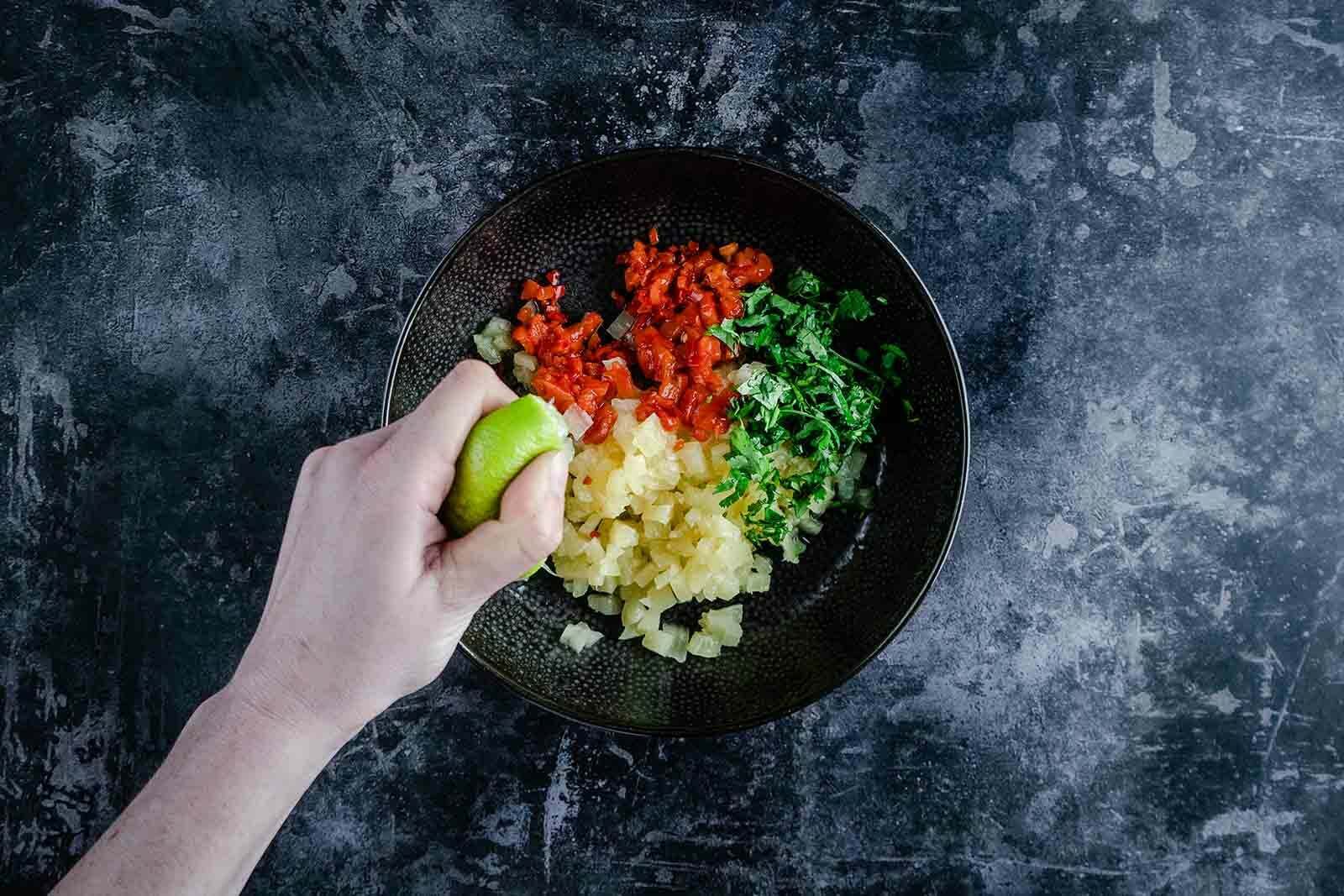 Finely dice the pineapple, chilli and coriander and combine with the juice of 1 lime in a small bowl