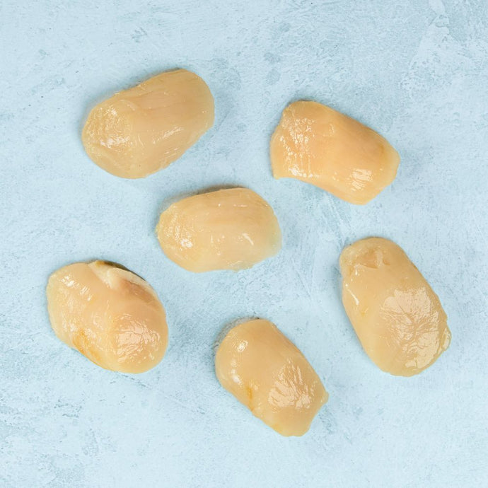 We buy all of our hand dived scallops from Jersey. They can be seasonal as the divers struggle to get out frequently during the winter and this in turn slows supply and shoots the price up in the off season. However we try to buy a year's worth during the abundant summer months so you can enjoy dived scallops all year round. Being hand caught means the seabed looks a lot neater and healthier than if they had been caught by dredging. They have also been hand shucked at source by the divers who, being keener on diving than shucking, generally leave the "vein" attached to their scallops. It's just a tiny thread - you can see glimpses of it in the picture. However, it will only take you a moment to remove this.