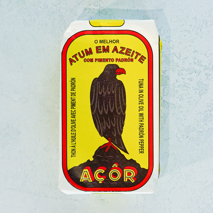 Açor Tuna in Olive Oil with Padrón Pepper is a premium Portuguese conserva that showcases tender, flaky tuna paired with mild Padrón peppers, preserved in smooth olive oil and lightly seasoned with salt. Rich in protein and full of Mediterranean character, this versatile tin is perfect for salads, sandwiches, tapas, or simply enjoyed on its own straight from the can. The result is a refined balance of savory tuna and subtly sweet, occasionally smoky pepper notes—bringing a distinctive Iberian flair to any dish.
